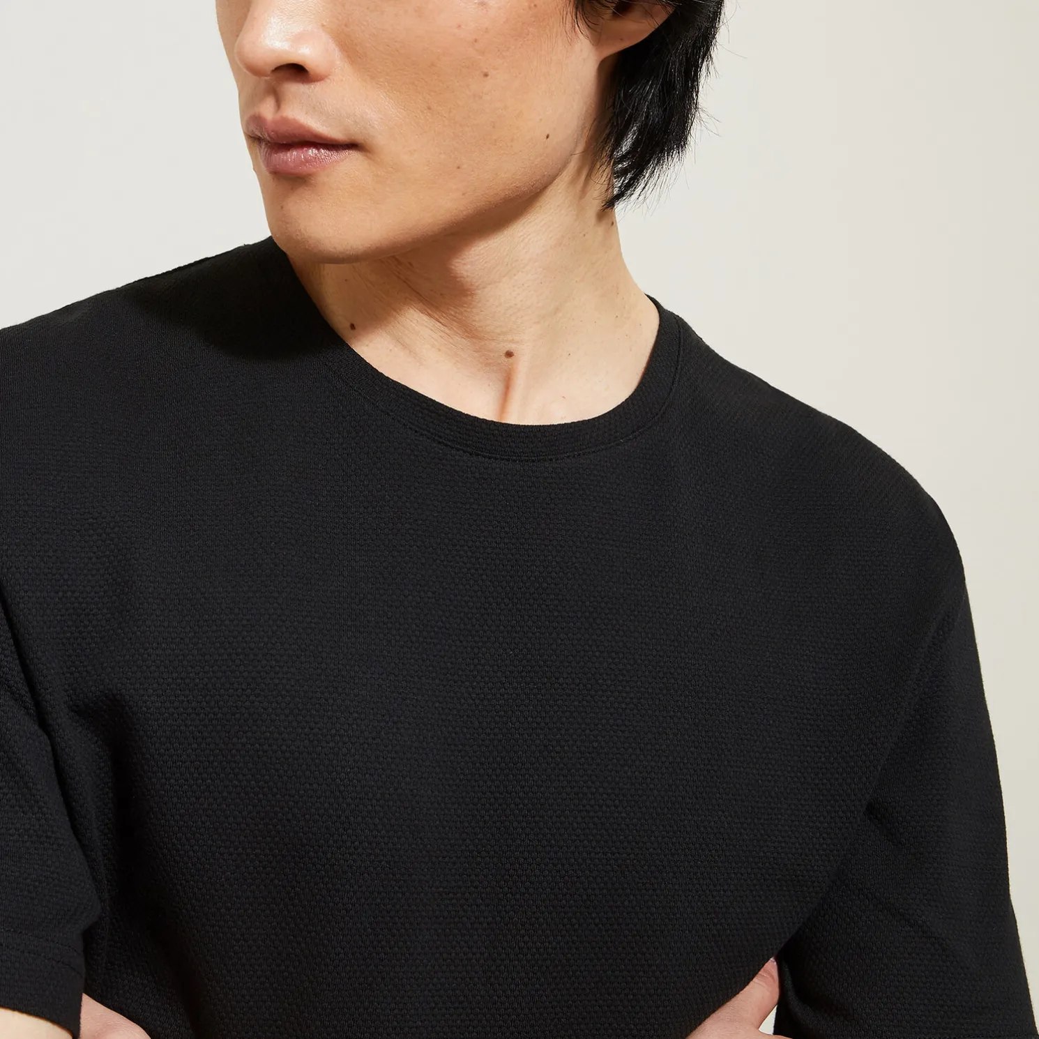 Dit T-shirt in een katoenen reliëfstof met elastaan mag in geen enkele dressing ontbreken en matcht met alles.