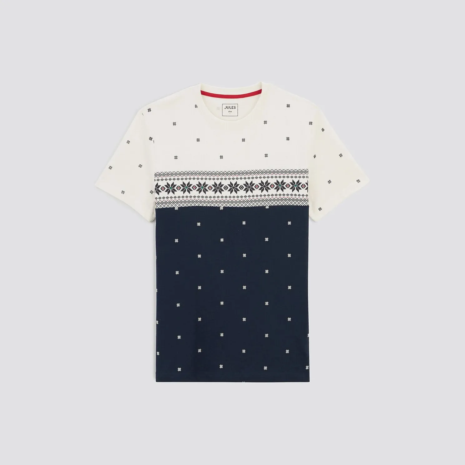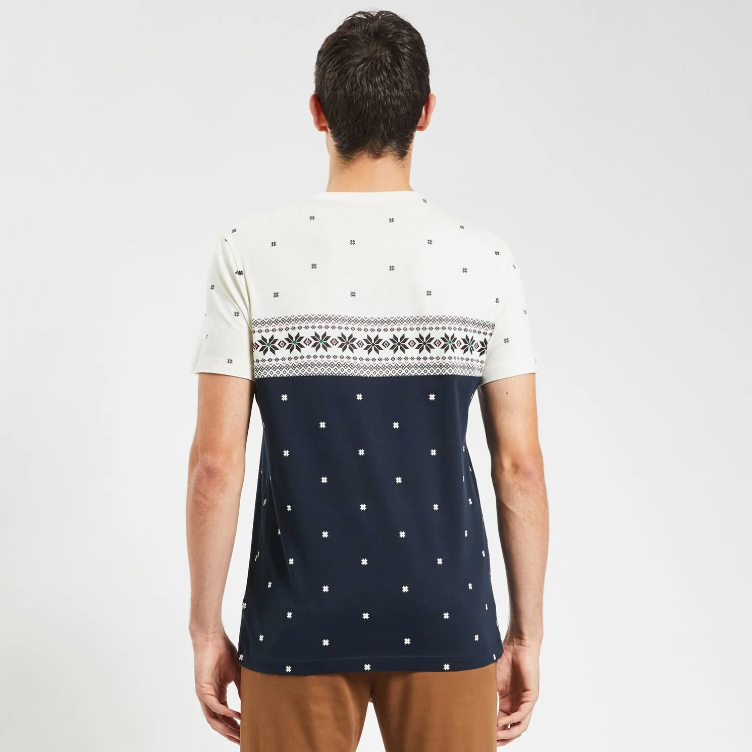 Dit colorblock fantasie T-shirt met korte mouwen heeft een ronde hals in ribboord, verschillende all-over prints, en is uitgevoerd in een slim snit die strak op het lichaam valt .Het model meet 1,86 m en draagt maat L.
